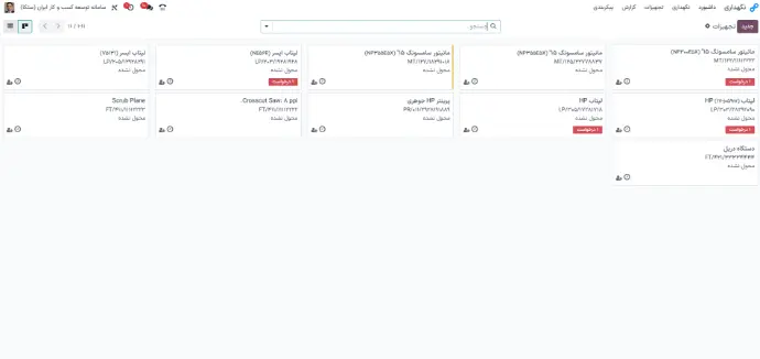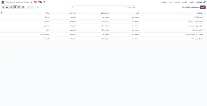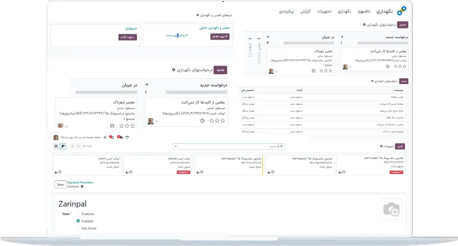 ماژول نگهداری همچنین به عنوان ثبت تجهیزات عمل میکند. هر تجهیز شامل اطلاعات شناسایی و گارانتی است و تب نگهداری شاخصهای قابلیت اطمینان را پیگیری میکند. دکمههای هوشمند امکان دسترسی سریع به تمام درخواستهای مرتبط با هر تجهیز را فراهم میکنند.